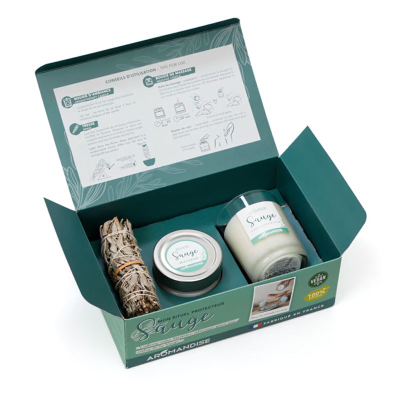 Contenu du coffret : une bougie, une bougie de massage et une tresse de sauge