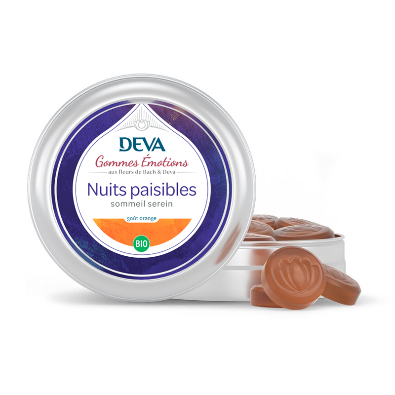 Les gommes émotions bio Nuit paisible DEVA goût orange vous aident à retrouver naturellement un sommeil réparateur. Formulées selon la tradition des élixirs floraux, ces gommes agissent sur les émotions qui perturbent le coucher et la nuit. Elles s’adressent aux personnes sujettes aux réveils nocturnes, aux cauchemars, aux pensées répétitives ou aux ruminations mentales qui empêchent de s’endormir ou de rester endormi.
