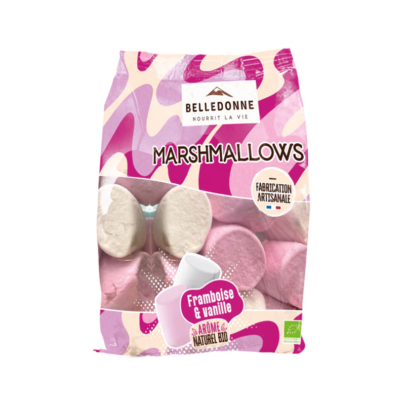 Marshmallows bio aux arômes naturels de framboise et de vanille. De délicieuses guimauves moelleuses et parfumées, idéales pour vos soirées au coin du feu, barbecues, anniversaires ou pour s'accorder un moment de gourmandise !