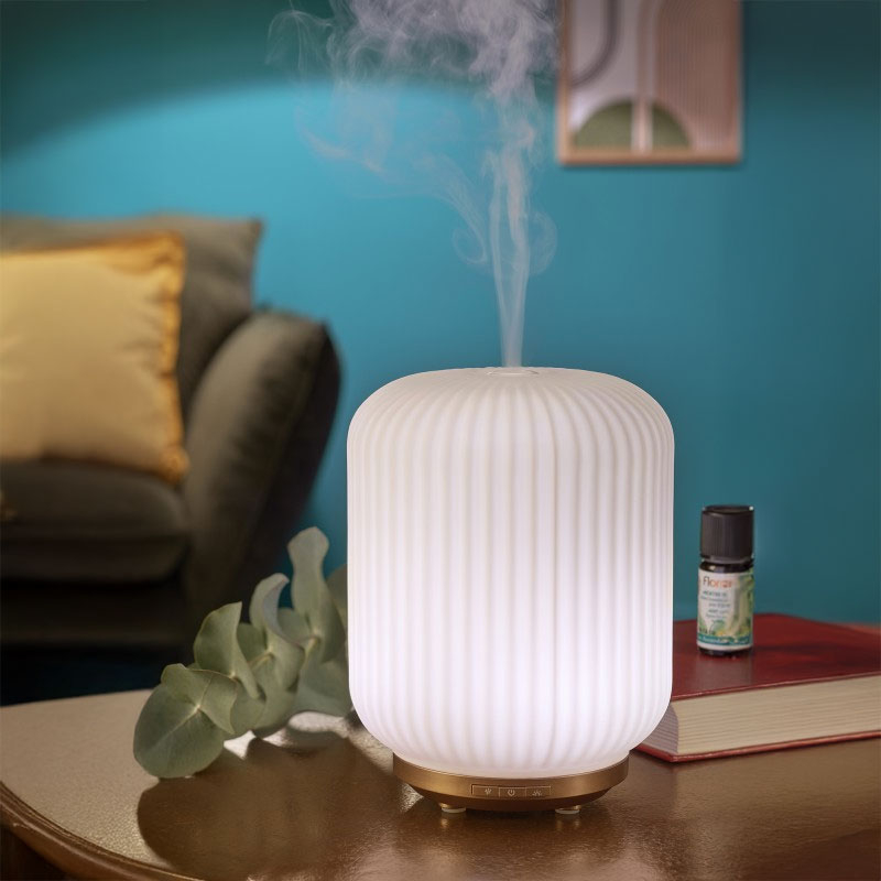 Diffuseur ultrasonique Elio, un diffuseur d’huiles essentielles pensé comme un véritable objet décoratif. Avec sa cloche en verre dépoli ondulé, ses lignes douces et sa luminosité variable, Elio apporte une touche d’élégance à votre pièce, tout en créant une ambiance parfumée délicate et apaisante.