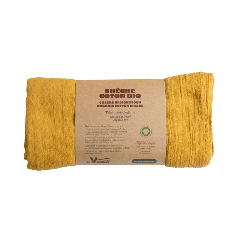 Chèche en coton Moutarde confectionné avec du coton 100 % biologique certifié GOTS. Idéal en toutes saisons, son tissus doux et respirant, son effet froissé et sa teinte moutarde ensoleillée en font un indispensable du dressing éco-responsable.