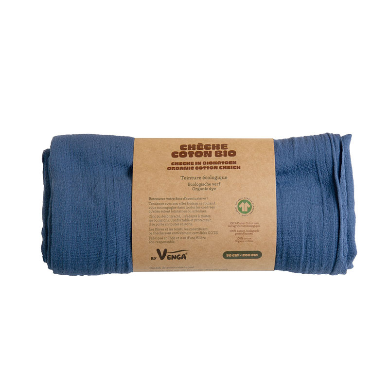 Chèche en coton Bleu confectionné avec du coton 100 % biologique certifié GOTS. Idéal en toutes saisons, son tissus doux et respirant, son effet froissé et sa teinte bleue profonde en font un indispensable du dressing éco-responsable.